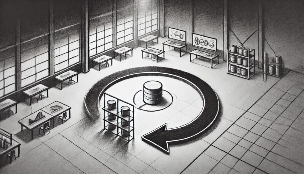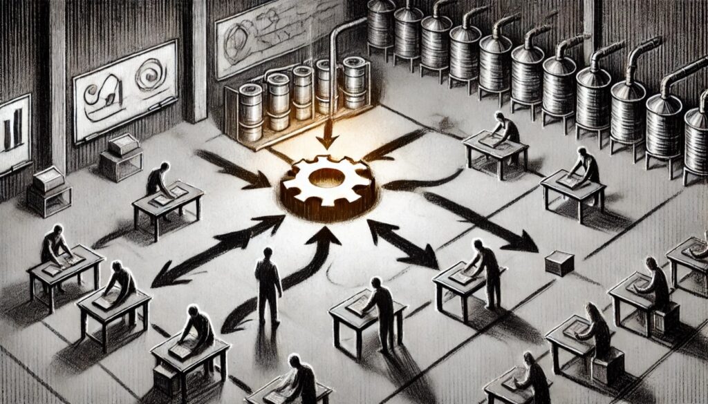 Przykład: W fabryce może to oznaczać, że pracownicy zajmujący się etapami poprzedzającymi spawanie będą dostarczać materiały w odpowiednich ilościach i czasie, by spawacz nie czekał na komponenty. Dzięki temu minimalizujemy przerwy w pracy ograniczenia, a cały proces przebiega płynnie.